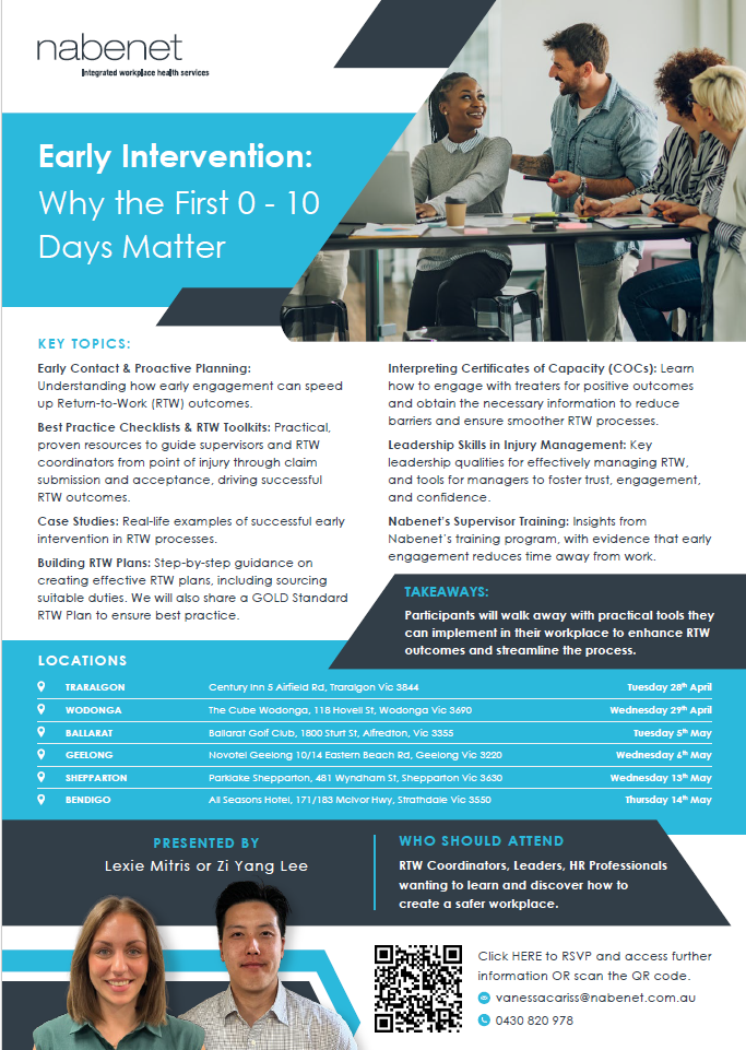 Nabenet is pleased to invite you to our upcoming Regional Lunch Series, designed to equip organisations with the tools and knowledge to improve Return to Work (RTW) outcomes through early intervention.